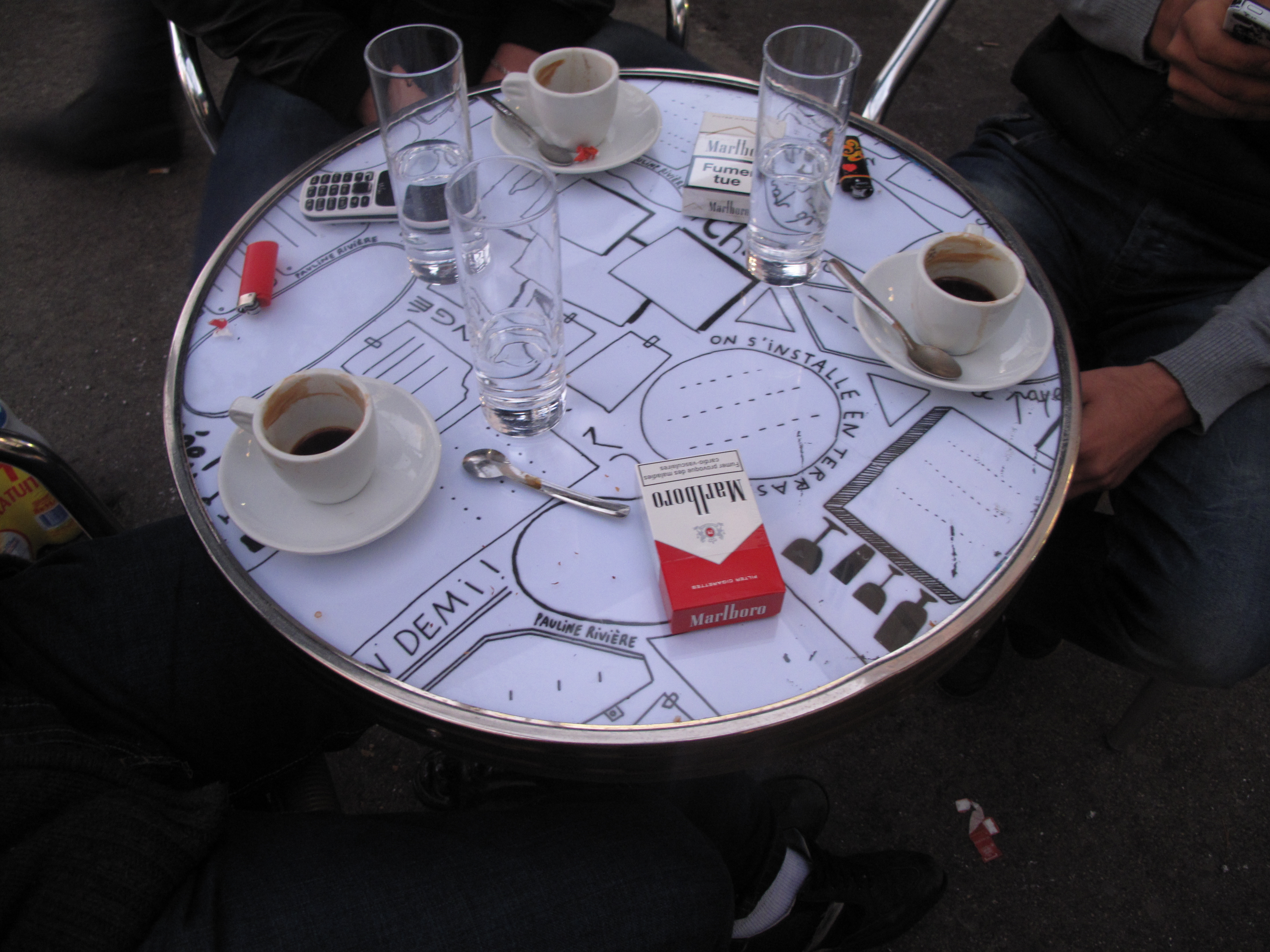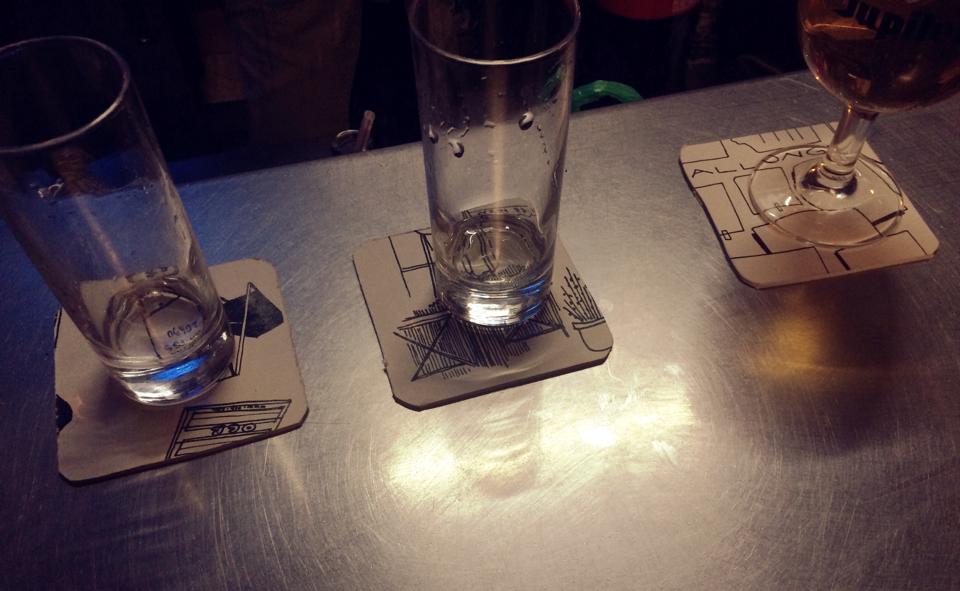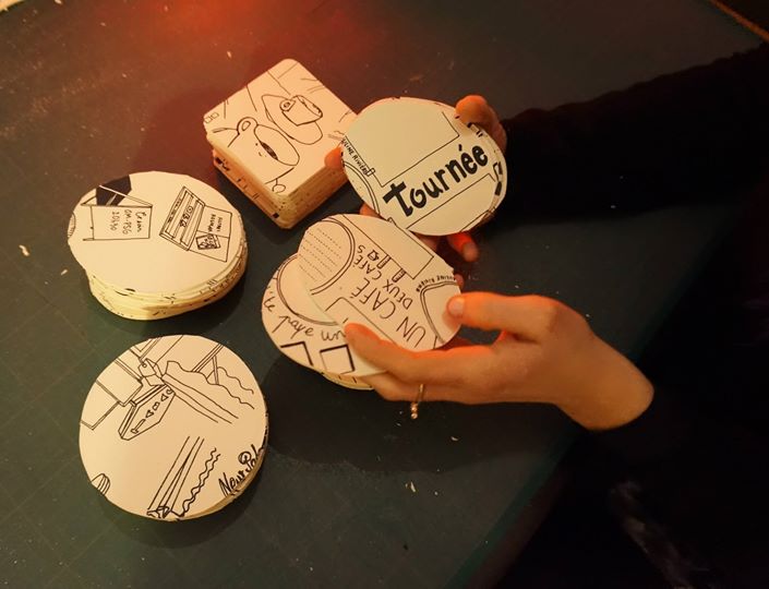 à partir d’une série de dessins d’observation en immersion, création de tables (impression numérique sur papier, 53cm de diamètre) et sous-bock (sérigraphie sur carton bois, dimensions variables)